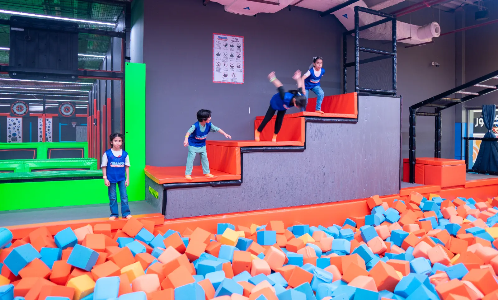The foam pit is one of the most popular zones on the trampoline court. Bounce off the surrounding trampolines and launch into a deep pit filled with thousands of soft foam cubes that cushion every landing. It is the perfect place to try your first flip, practice aerial tricks, or just freefall for fun. Staff keep the area supervised and manage the flow so everyone gets a turn. The foam pit is part of the trampoline court and included in every jump session at all three Trampo venues.