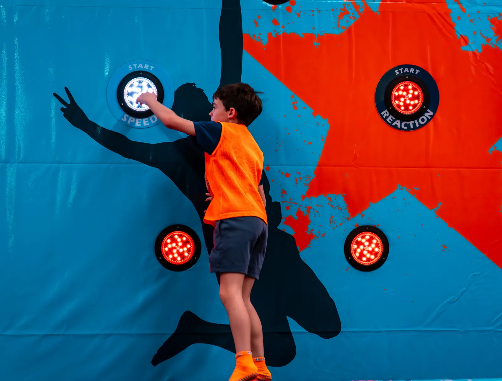 The Interactive Wall is a floor-to-ceiling LED panel that projects targets, patterns, and timed challenges. Players hit the glowing spots as fast as they can, compete for high scores, and try to outdo each other round after round. It is a full-body reaction game that feels more like a video game than exercise, but leaves you out of breath.