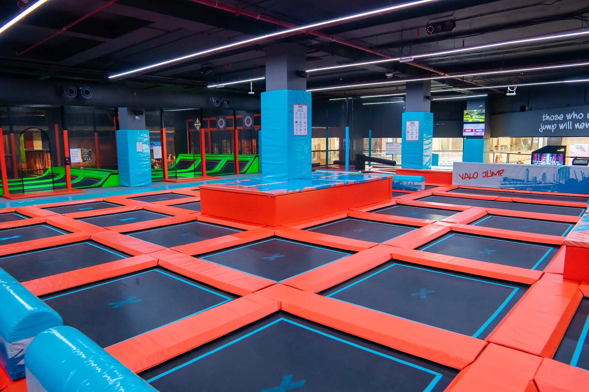 Trampo’s main arena connects 16 trampoline zones across every venue. Kids bounce between foam pits, slam-dunk on spring-loaded basketball hoops, dodge in padded dodgeball courts, race through the obstacle course, and launch into the airbag. Sessions run continuously so families jump in whenever they arrive.
