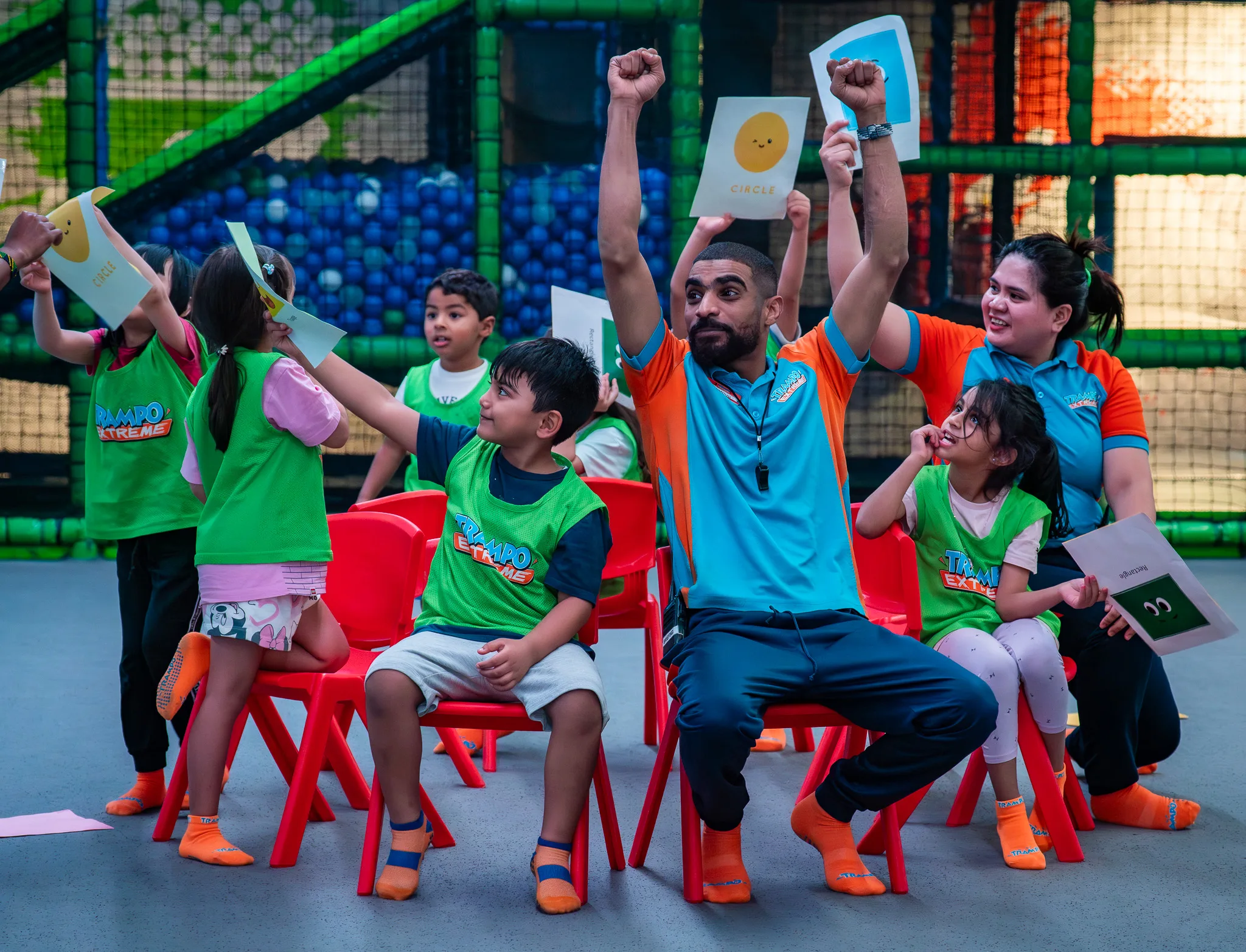 Fun on soft play and trampoline areas including treasure hunts, floor is lava, relay races, and more.